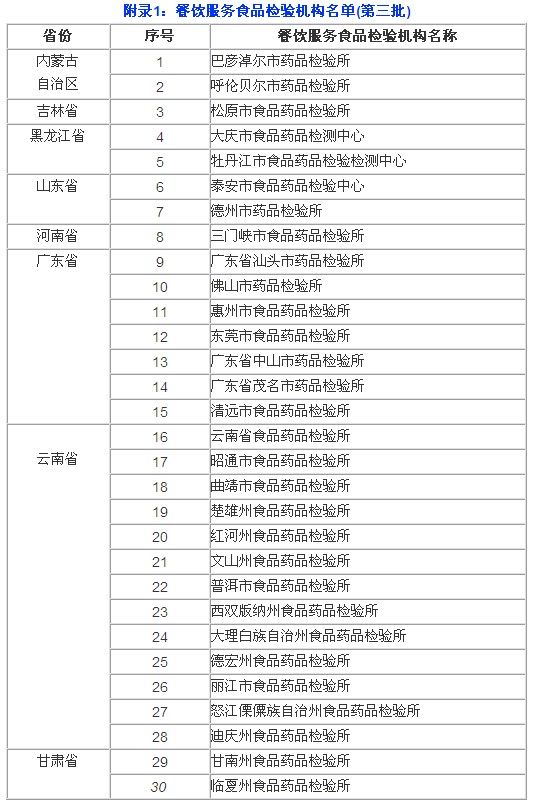 第三批公布的餐飲服務食品檢驗機構包括內蒙古、吉林、黑龍江、山東、河南、廣東、云南、甘肅等8個省(區(qū))共計30家食品藥品檢驗機構。
